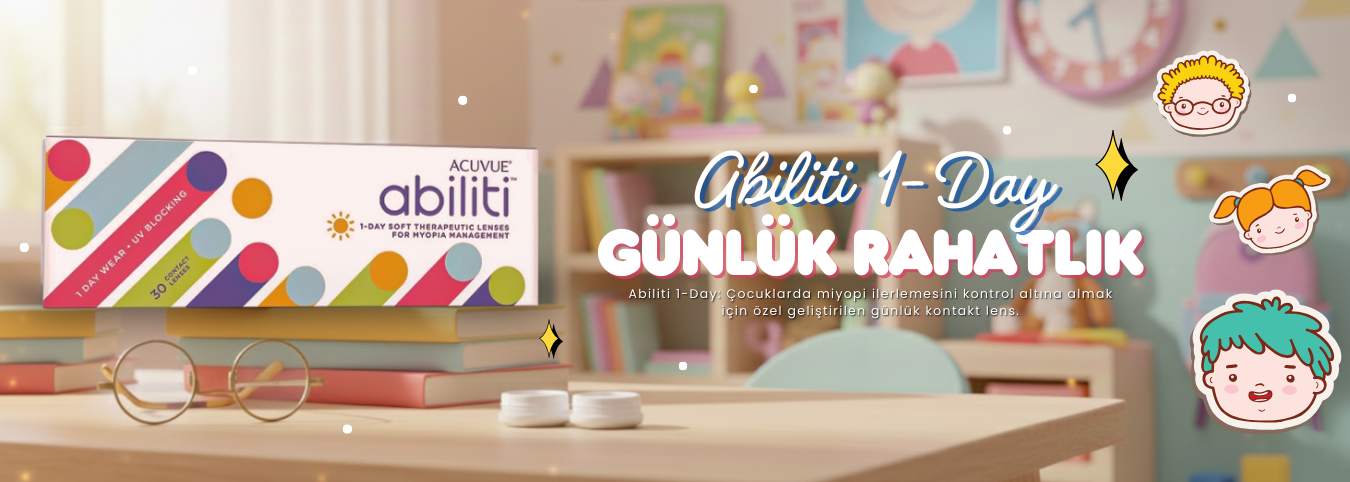 Abiliti 1-Day, çocukların günlük ihtiyaçlarına ve göz sağlığına göre tasarlanmış, özel teknolojiye sahip bir kontakt lenstir. Johnson & Johnson Vision tarafından geliştirilen bu lens, miyopiyi sadece düzeltmekle kalmaz; aynı zamanda ilerlemesini yavaşlatmaya yardımcı olur.