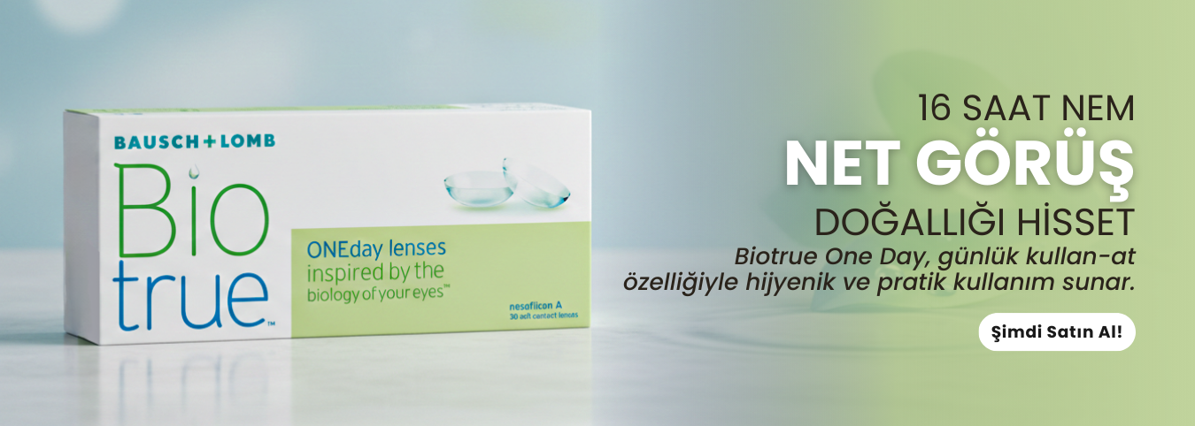 Biotrue One Day günlük kullan at lenslerdir. %78 su oranı içeriği sayesinde üstün konfor sağlar. Normal insan gözünün PH su oranıyla eş değerde üretilen Biotrue One Day tüm gün boyunca hiç lens yokmuş hissi yaşatacaktır. Hd optik özelliği ile daha keskin ve daha canlı bir görüş elde etmenize yardımcı olacaktır. Ayrıca UV koruma özelliği ile gözlerinizi güneşin zararlı ışın etkilerine karşı korumaktadır. Kutu içerisinde 30 adet lens bulunmaktadır. Her iki gözün numarası aynı ise 15 gün 1 sağ ve sol numaralar farklı olması durumunda 2 kutu alınarak kullanımınız 1 aya çıkmaktadır. Çığır açan HyperGel materyaline sahip ilk ve tek günlük kullan-at kontakt lens BioTrue Oneday göz gibi çalışarak gün boyu canlı ve rahat bir görüş sağlar.