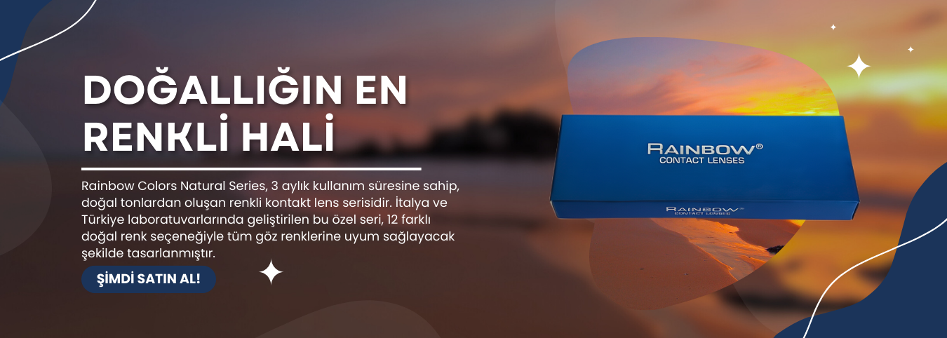 Rainbow Colors Natural Series 3 aylık kullanılan renkli kontakt lenslerdir. 12 adet doğal renkten oluşmaktadır. Akdeniz insanının sıcaklığını göz rengine yansıtan, İtalya ve Türkiye laboratuvarlarında geliştirilen Rainbow Colors Natural Series lensleri , tüm göz renklerine uyacak şekilde tasarlanmıştır. Sandviç sistemi ile boyanmıştır ve kullanım rahatlığı yüksek bir lenstir.
